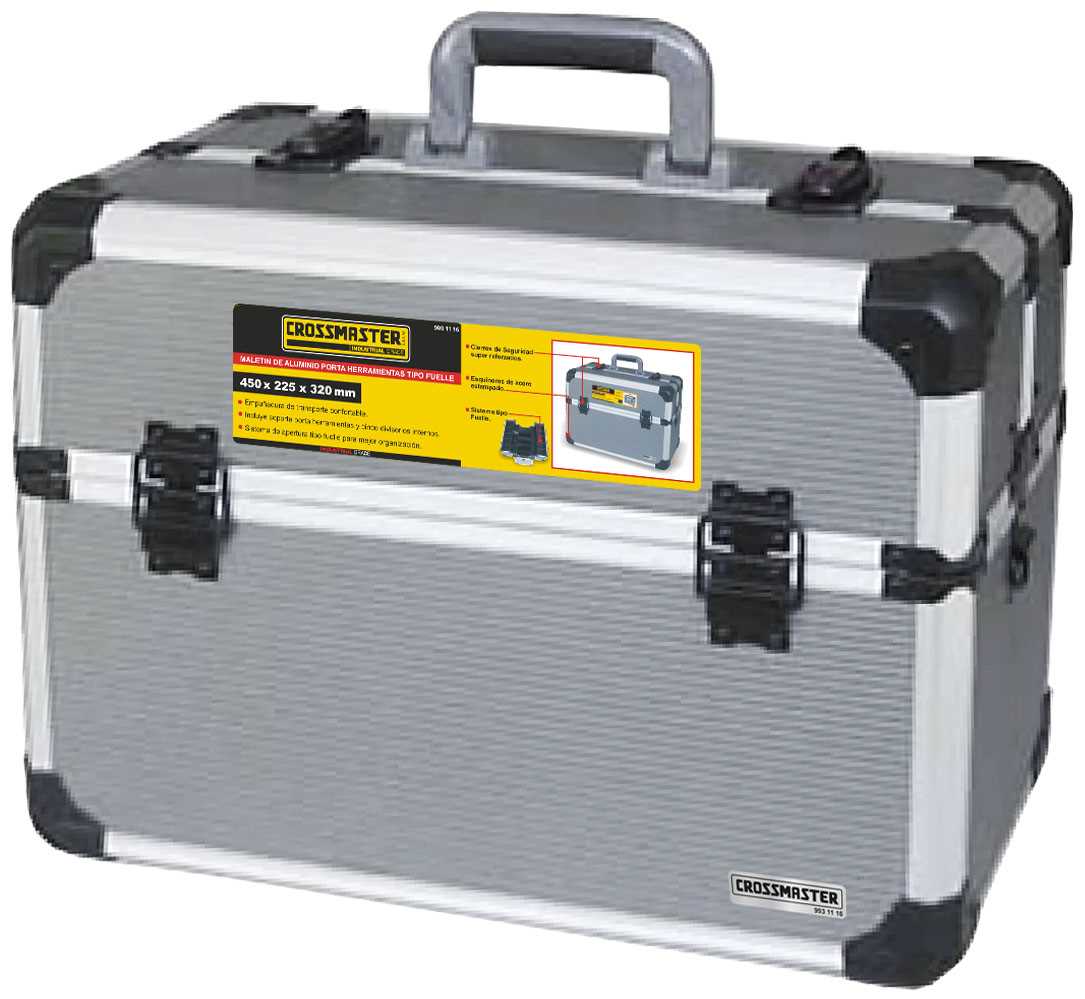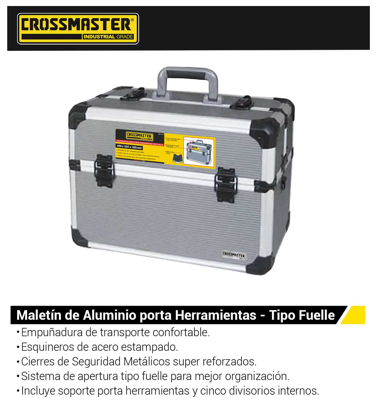 Caja de Aluminio porta herramientas – Tipo Fuelle. De medidas 450 x 225 x 320 mm. Tiene soporte para herramientas con divisorios.