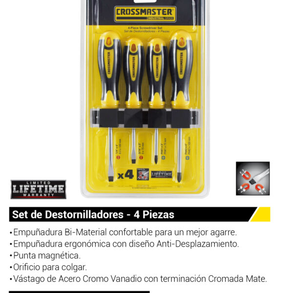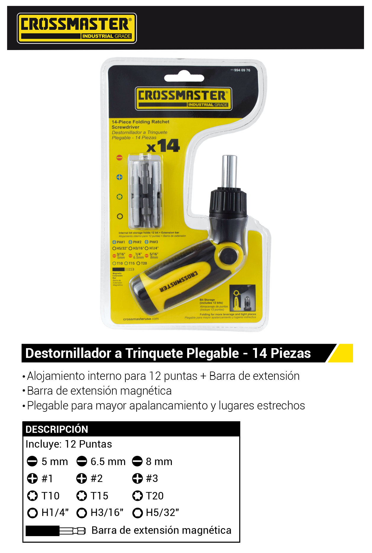 - #1 – #2 – #3 ; H5/32″ – H3/16″ – H1/4″ ; 4/6 mm – 5/8 mm ; T10 – T15 – T20 ; Barra de Extensión Magnética.