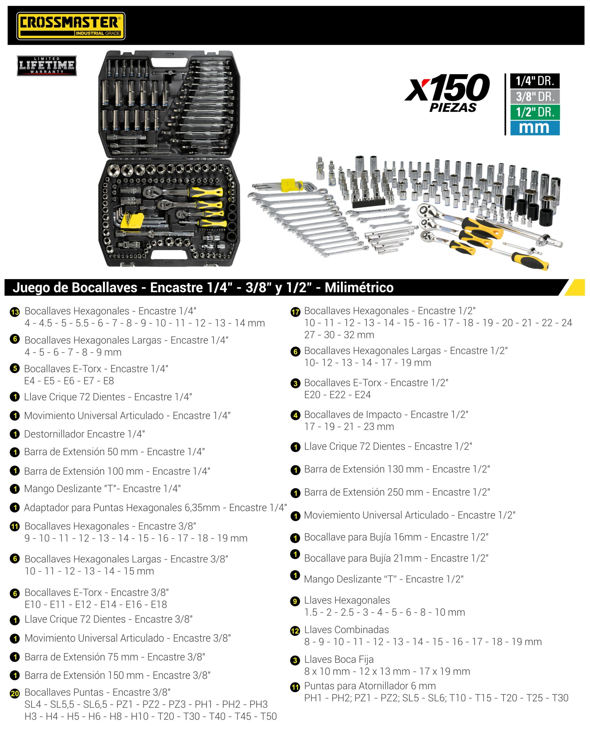 Juego de bocallaves – Encastres 1/4″, 3/8″ y 1/2″ – Milimétrico – 150 piezas