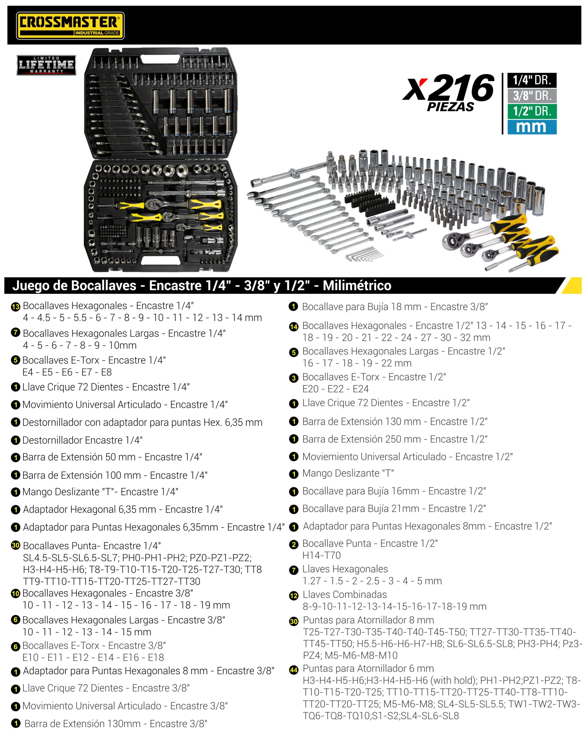 Juego de bocallaves – Encastres 1/4″, 3/8″ y 1/2″ – Milimétrico – 216 piezas