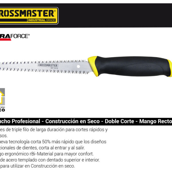 - Mango Bi-Material, ergonómico para mayor control y confort, atornillado a la hoja dotándolo de una distribución uniforme de la fuerza a lo largo del dentado.