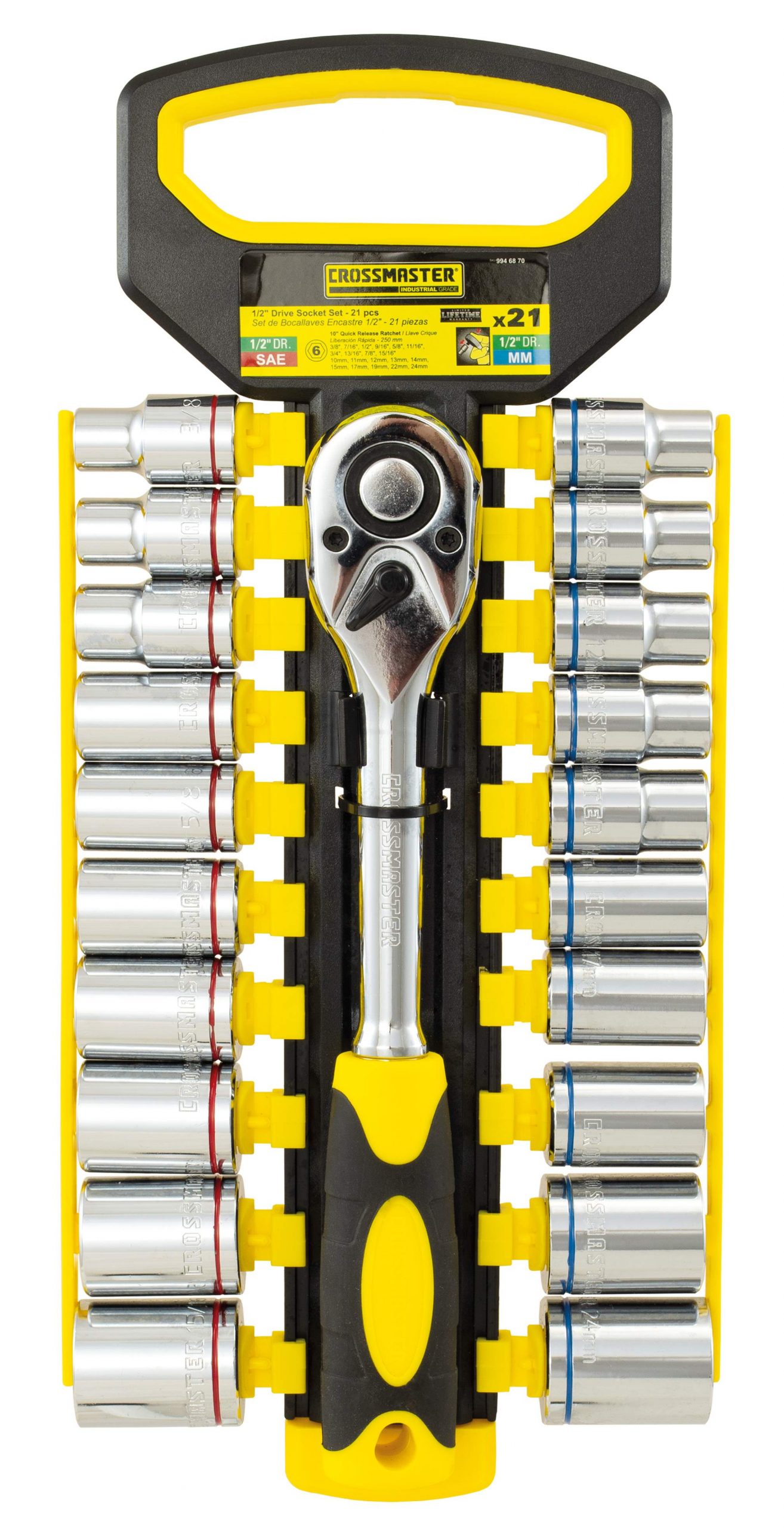 Set de Bocallaves de encastre de 1/2″ con 21 piezas. 3/8″; 7/16″,1/2″,9/16″;5/8″11/16″,3/4″,7/8″,15/16″”. 10mm, 11mm, 12mm, 13mm, 14mm, 15mm, 17mm, 19mm, 22mm, 24mm + llave crique de liberacion rapida (140mm)