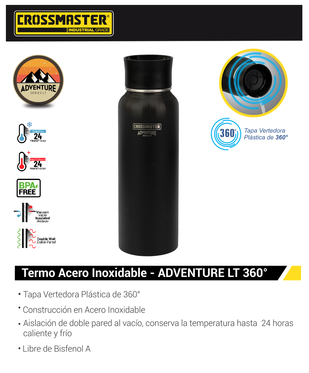 - Aislación de doble pared al vacío, conserva la temperatura (caliente y frío) hasta 24 horas.